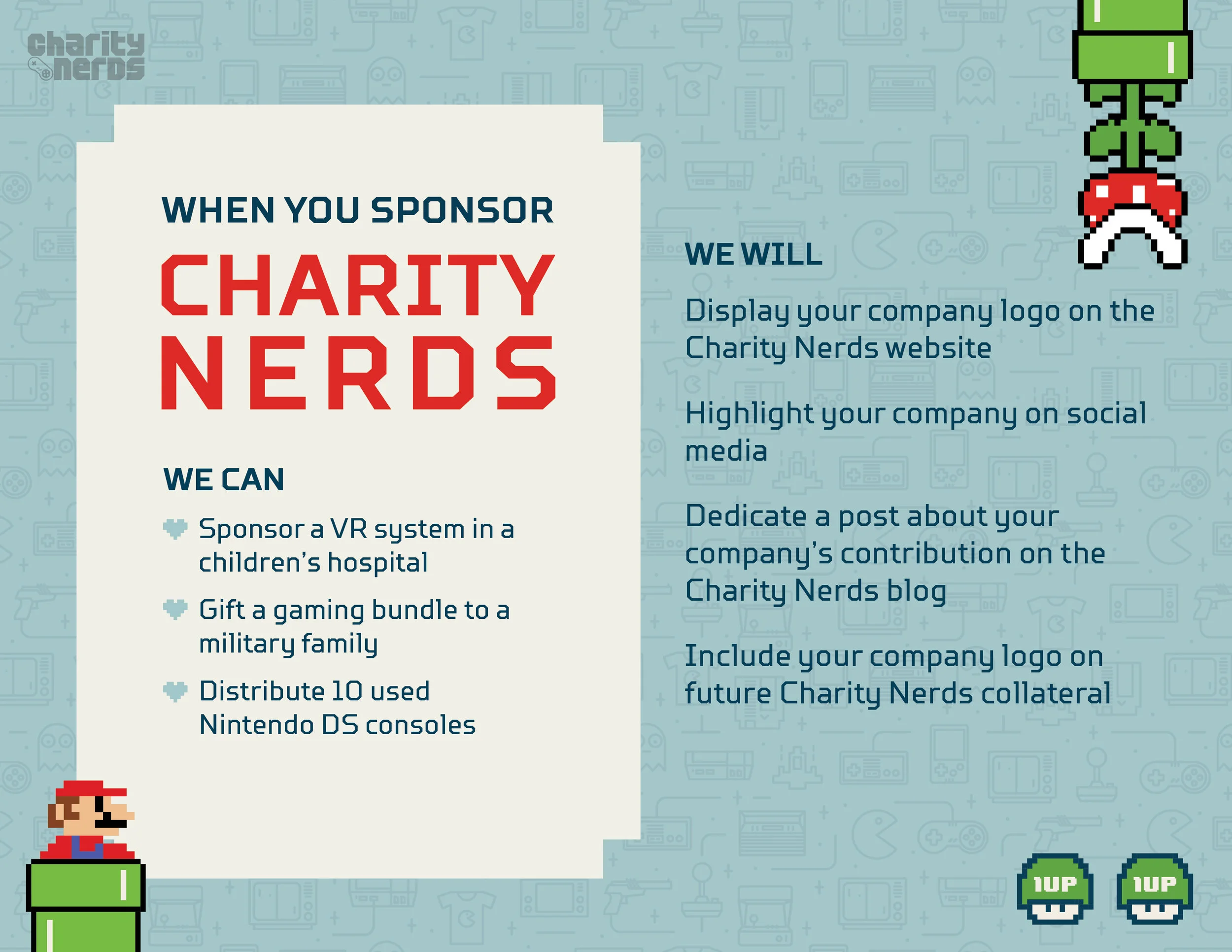 Charity Nerds is a non-profit dedicated to improving children's hospital stays through the power of play. With sponsorship and donations, Charity Nerds gifts video games and gaming consoles to children in hospitals to connect families during difficult circumstances.